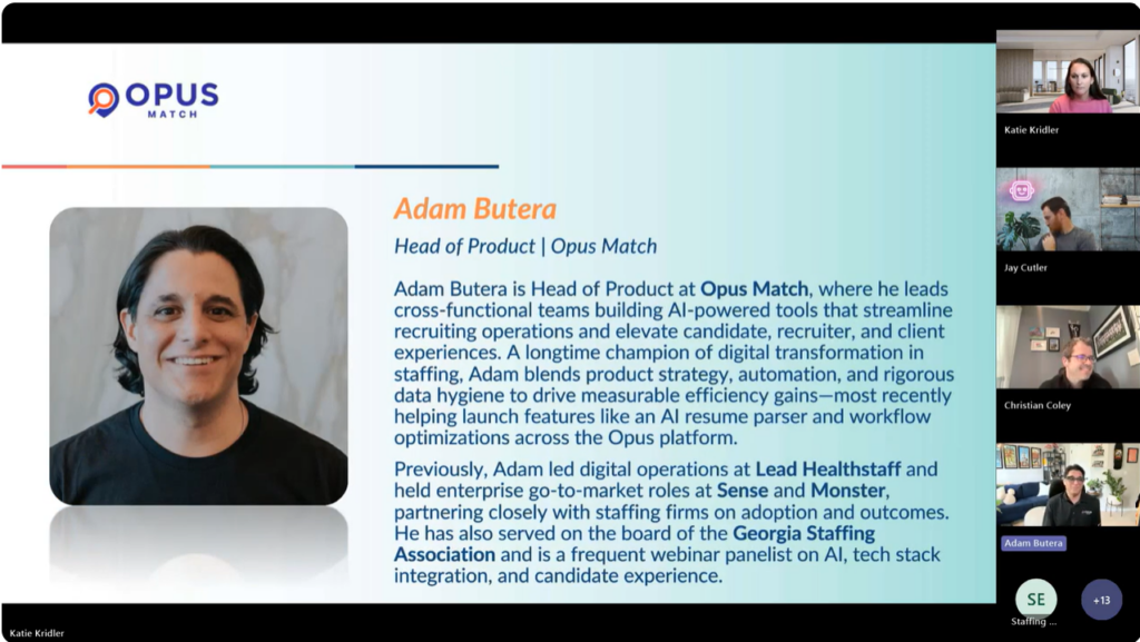 That’s why Newbury Partners hosted the series finale of their webinar series: “Find Fast. Engage Smarter. Place Better. The New Rules of Recruiting.” The event brought together experts from Staffing Engine, SourceFlow, and Adam Butera, Head of Product at Opus Match, to share actionable strategies for how firms can adapt and thrive.